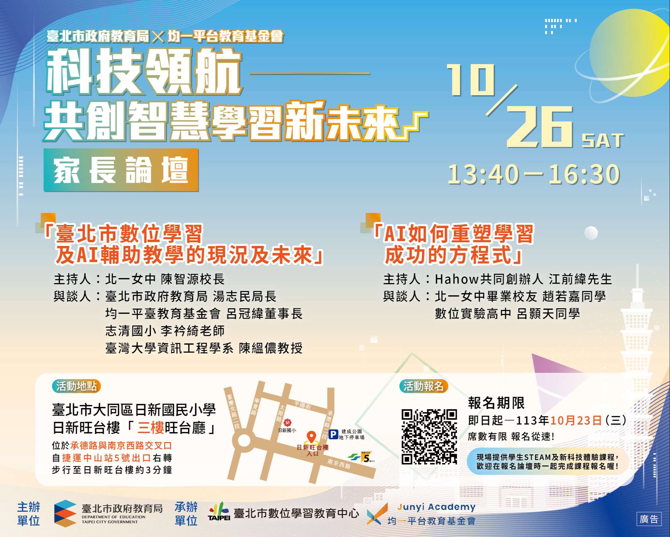 為推動科技輔助自主學習、創新學習及AI輔助教學, 特別辦理「科技領航–共創智慧學習新未來家長論壇活 動,與家長說明科技輔助學習政策推動現況、邀集專家學 者、第一線教師與家長進行論壇,重點如下: