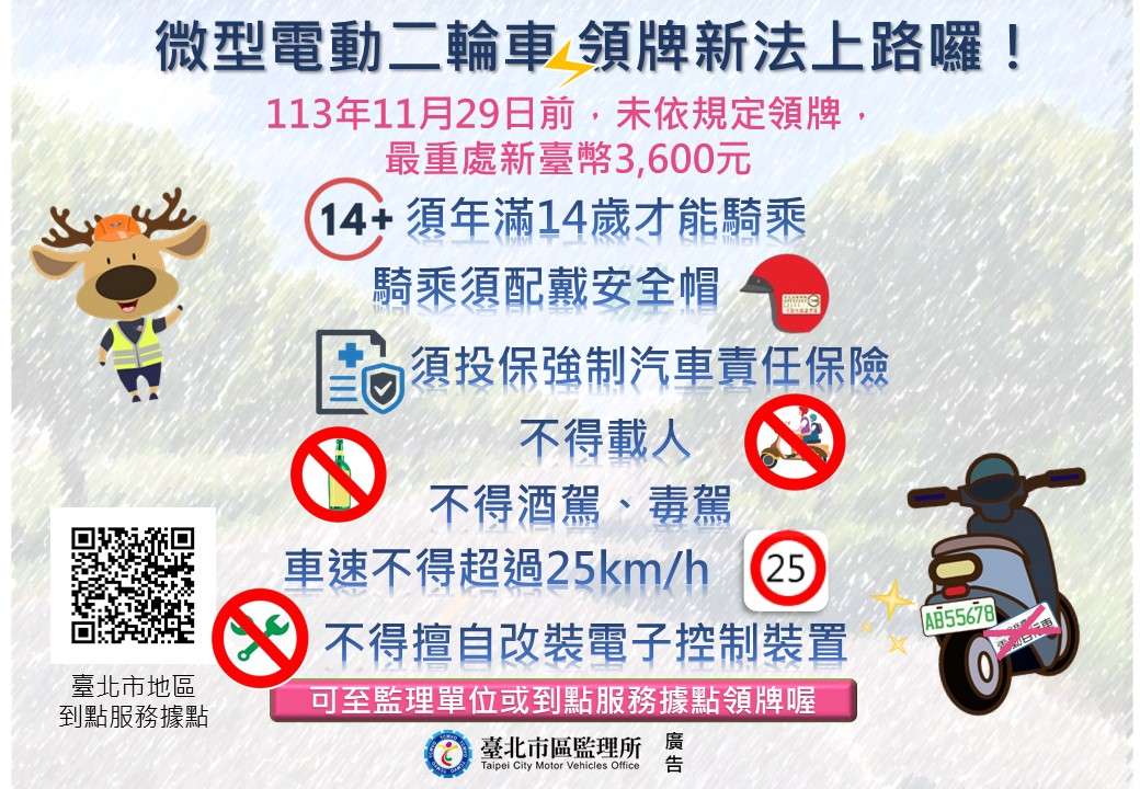 一、微型電動二輪車(原稱電動自行車)自113年11月30日起納 管,未掛牌上路,警方將依法取締。騎乘微型電動二輪車 應遵守之規定:駕駛人需年滿14歲,需配戴合格安全帽、 不可騎上人行道及自行車道(河濱自行車道除外)、不得 載人、最大行駛速率為25km/h以下、不得擅自改裝電子控 制裝置或原有規格、不可酒駕與毒駕,須依規定停車並遵 守交通標誌標線號誌駕駛。