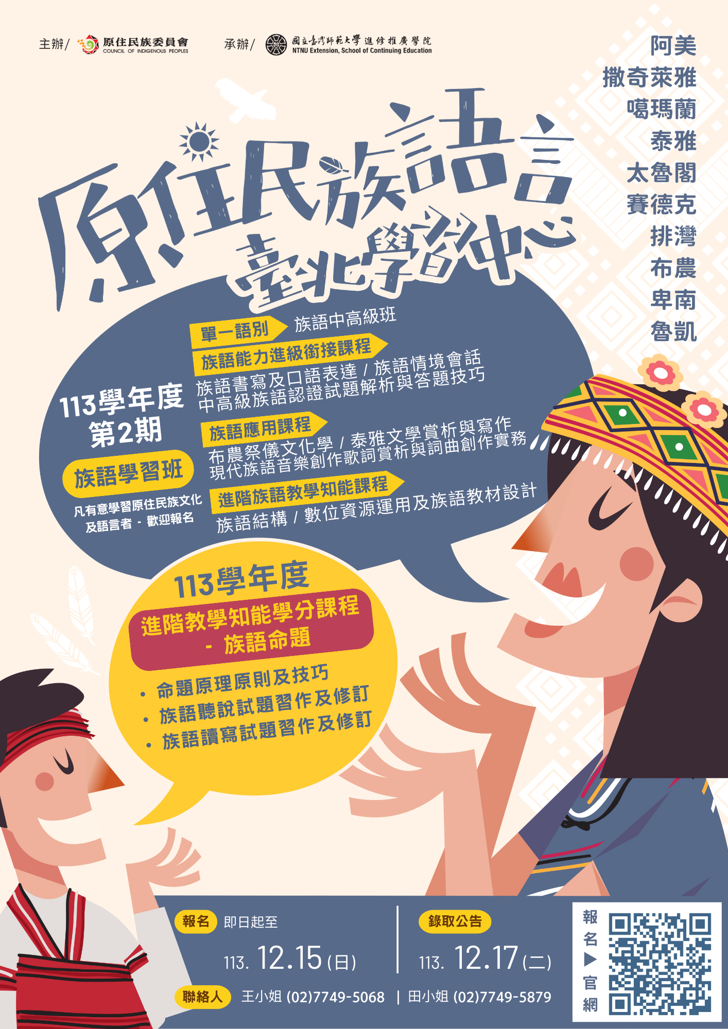 二、為協助培育原住民族語言師資,強化其命題能力,期有效提升評量設計的質與量,同時協助強化命題技巧之傳承,本校於113學年度持續辦理旨揭專班。