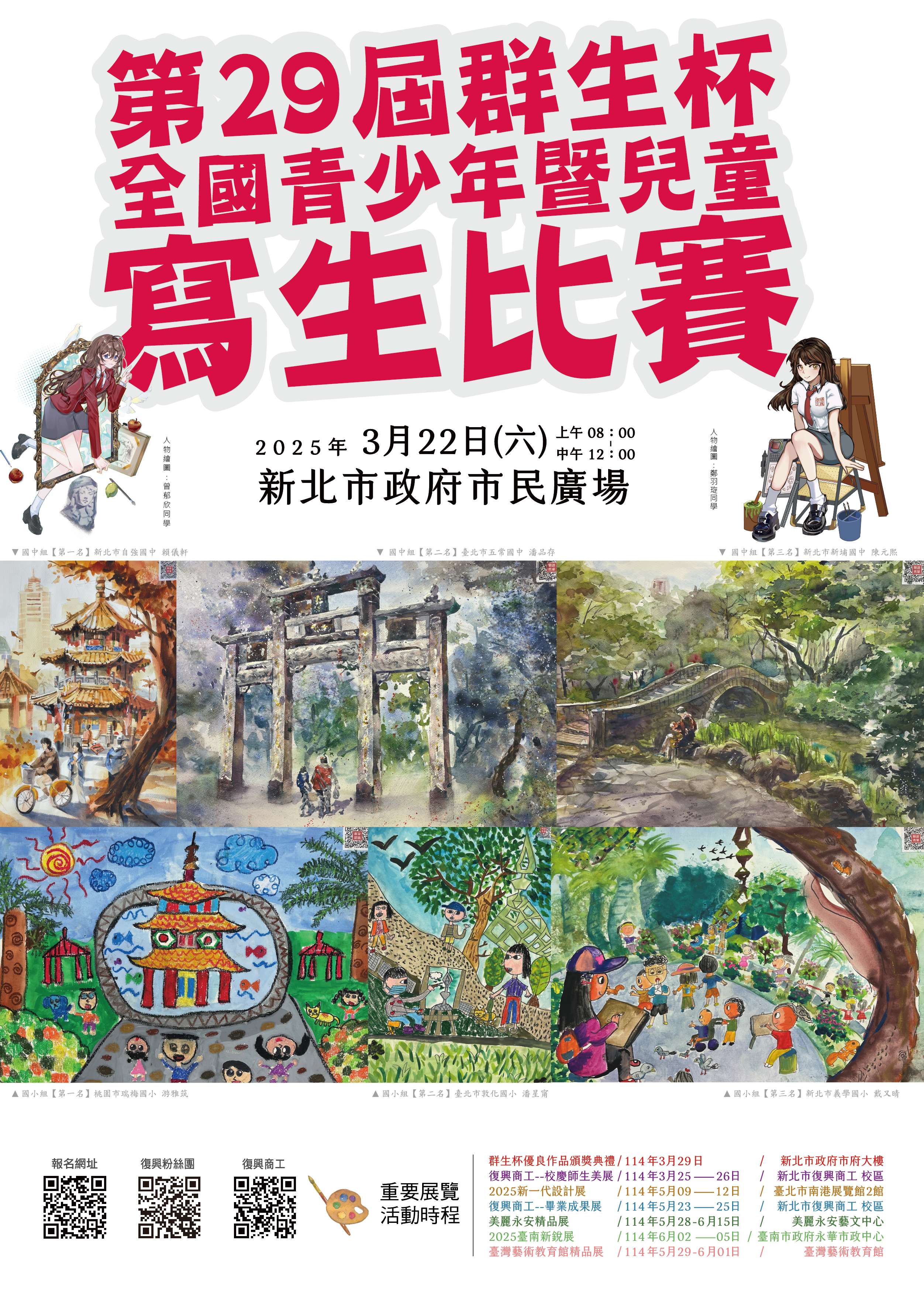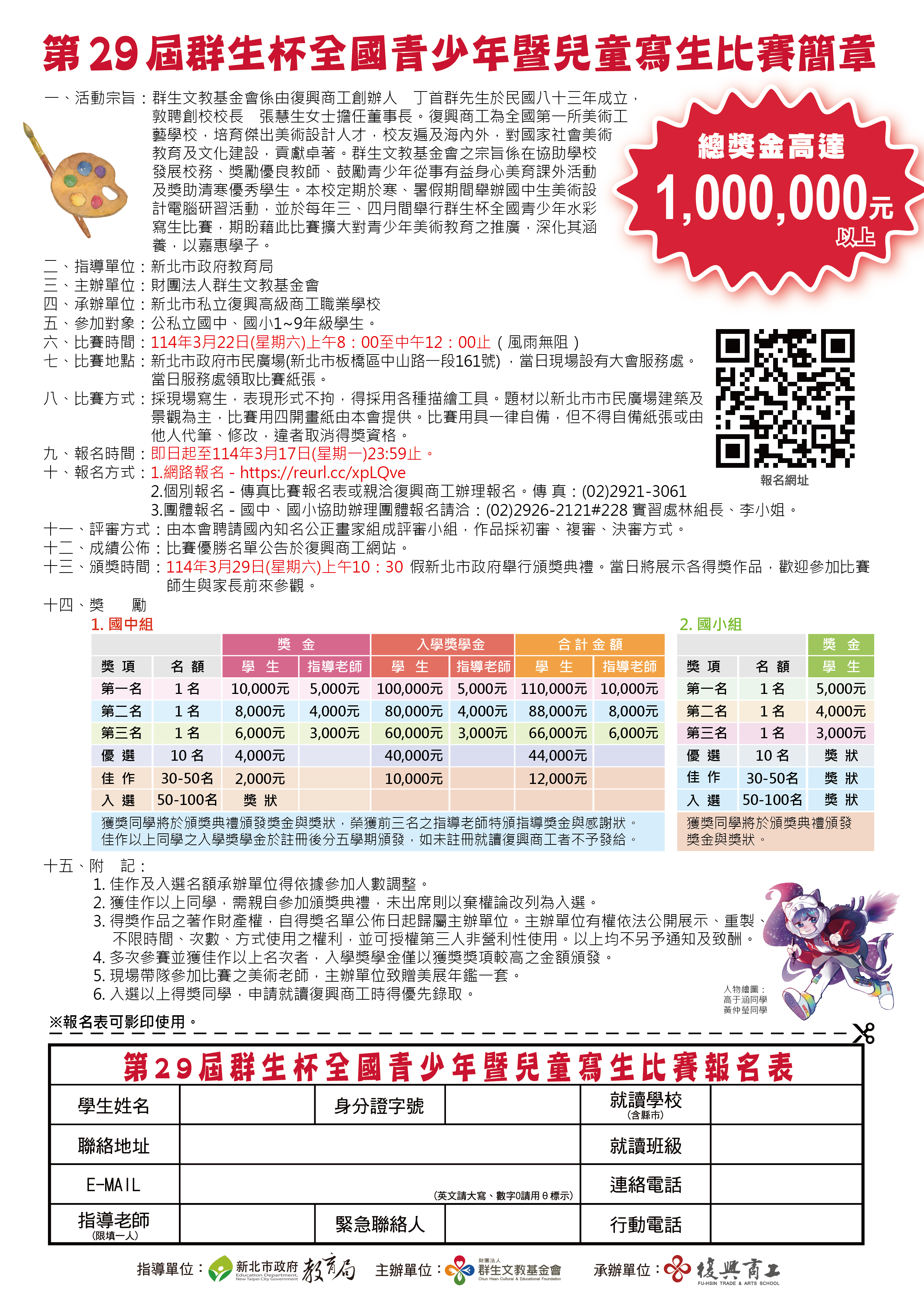 五、報名方式:採線上報名, (即日起至114年3月17日(一)23:59止)六、比賽簡章公告於群生基金會網站首頁 ,敬請下載查閱。