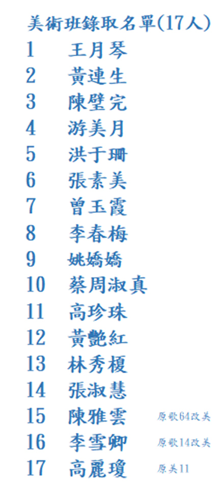 z 因歌唱及書法班已額滿,如您在候補名單上但想去尚未額滿的美術班,請於明天開課典禮結束後告知,將為您安排至美術班上課。
