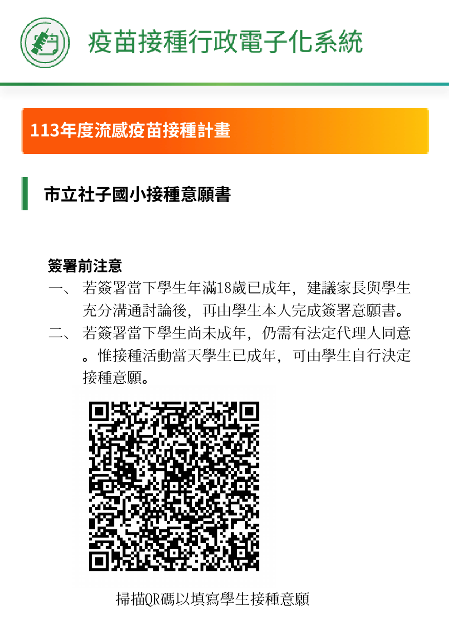 本校配合本縣/市衛生局合約醫療團隊預計於113年10月31日為您的子女進行流感疫苗接種服務,特此通知並徵求您的同意。