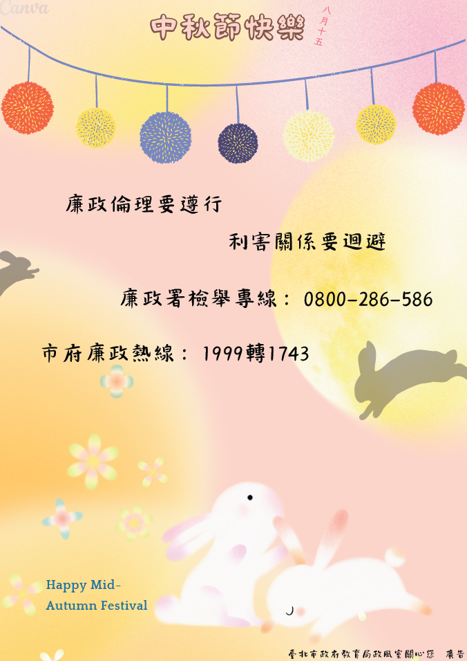 中秋佳節將至,月圓人團圓,我們在溫馨氛圍中,也要牢記公務員的廉政倫理。依《臺北市政府公務員廉政倫理規範》,同仁應秉持「不收禮、不送禮」原則,對於與職務有利害關係者的餽贈、宴請,應拒絕、退還或簽報,以維護公正無私的行政形象。